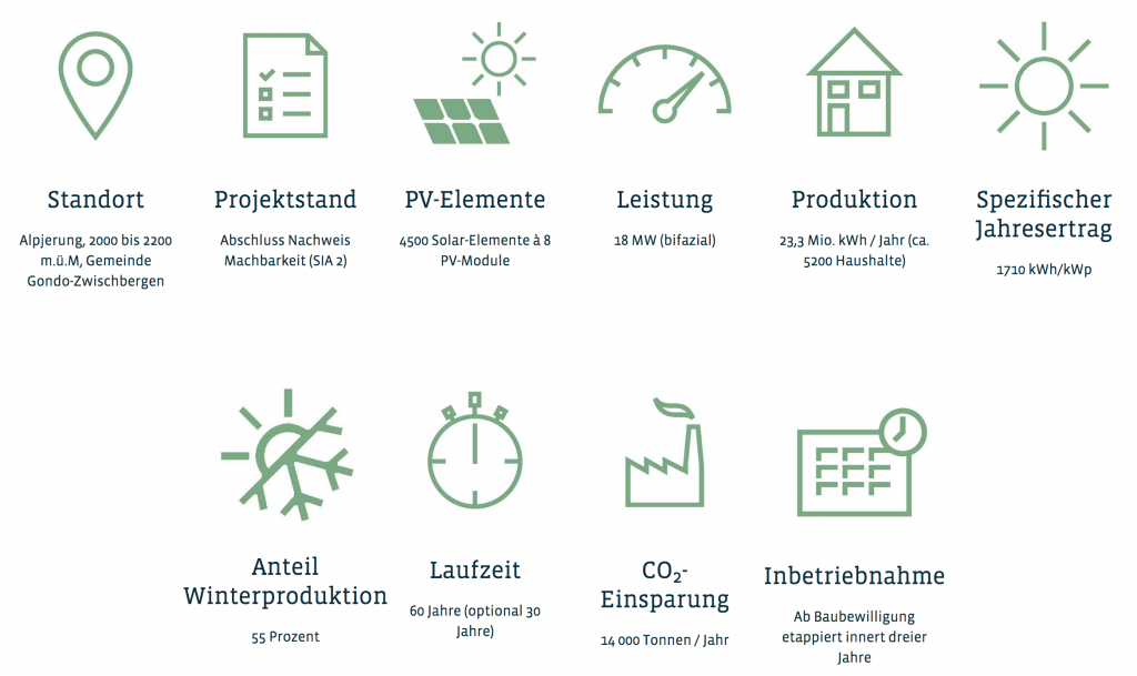 Eine wichtige Rolle bei der Abwägung der Vor- und Nachteile einer Solar-Grossanlage in den Alpen könnte das erwähnte Projekt Gondosolar einnehmen, das in der Planung bereits weit fortgeschritten ist. Dabei sollen auf einem privaten Grundstück in gut 2000 Metern Höhe 4500 Solarelemente zu je acht Modulen auf 200 Reihen verteilt installiert werden. Insgesamt ist eine Fläche von 100’000 Quadratmetern nötig. Das entspricht vierzehn Fussballfeldern: zehnmal mehr als bei «AlpinSolar». Weitere wichtige Kennzahlen dieses Projekt sind in der folgenden Grafik zu sehen, die auf der Webseite von Gondosolar zu finden ist (siehe hier).
