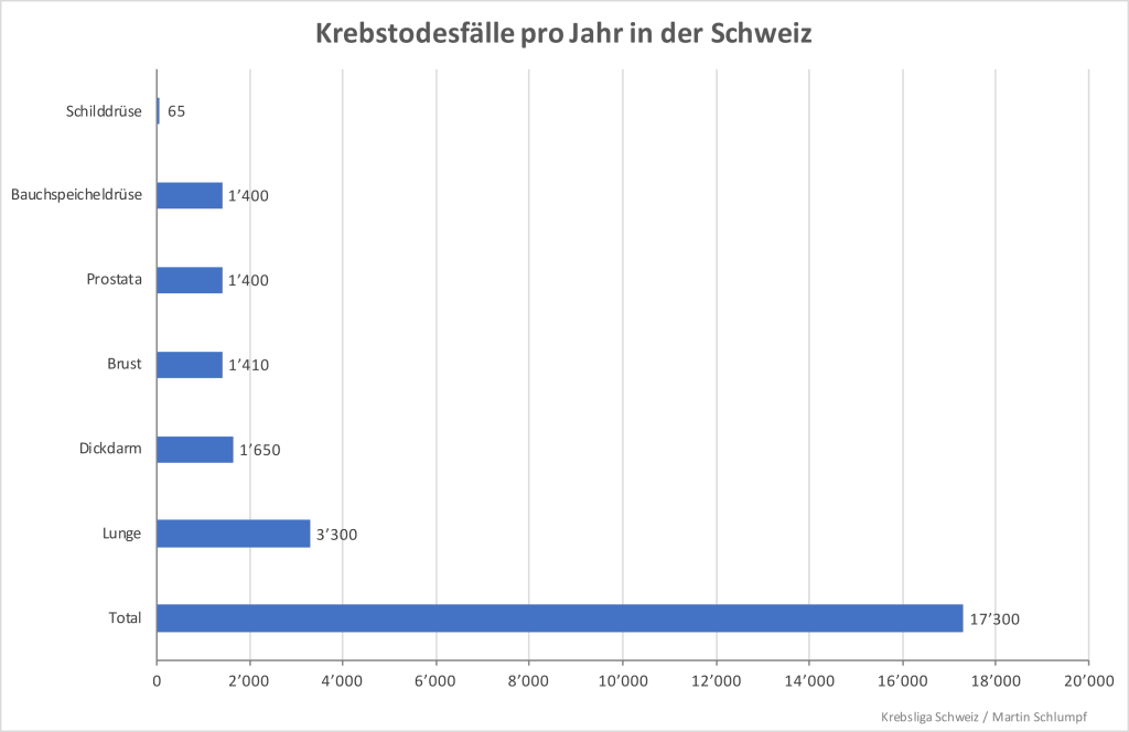 Alle Zahlen der Grafik geben Durchschnittswerte für den Zeitabschnitt von 2015 bis 2019 wieder. In dieser Zeit gab es im Schnitt jährlich 17’300 Menschen, die in der Schweiz an Krebs gestorben sind (unterster Balken). Darüber sind die fünf Krebsarten aufgelistet, die am meisten Todesopfer gefordert haben: Mit Abstand an der Spitze steht Lungenkrebs mit 3’300 Todesfällen.
