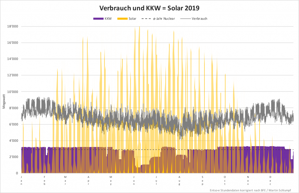 Als Referenzjahr habe ich 2019 gewählt, weil in diesem Jahr der Verbrauch noch nicht durch Corona beeinträchtigt wurde. Die folgende Grafik zeigt also für dieses Stichjahr erstens die tatsächliche Stromeinspeisung der Kernkraftwerke, zweitens die hochgerechnete Einspeisung der PV-Anlagen unter der Bedingung, dass sie soweit ausgebaut sind, um dieselbe Jahresmenge Strom zu liefern wie die KKW, sowie drittens den Verbrauch – und zwar in allen 8760 Stunden des Jahres.