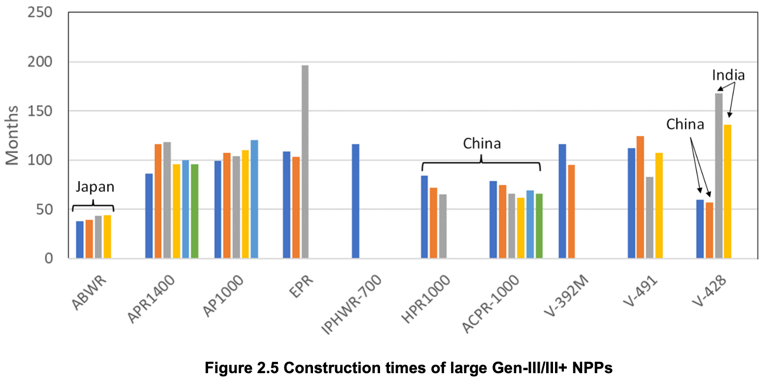 Etwas ungewohnt wird hier die Bauzeit in Monaten angegeben (100 Monate entsprechen gut 8 Jahren). Auf der x-Achse sind die zehn verschiedenen Reaktortypen angegeben, die bisher in Generation III/III+ gebaut wurden. Zwei Ausreisser nach oben stechen heraus: der EPR in Olkiluoto (Finnland) mit einer Bauzeit von 16 Jahren und der V-428 in Indien, dessen Erstellung 14 Jahre in Anspruch nahm.