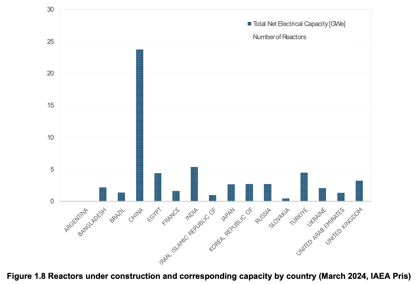 Die Grafik zeigt, wieviel zusätzliche Leistung in GWe die Kernkraftwerke zur Verfügung stellen, an denen in den verschiedenen Ländern aktuell gebaut wird. Beim Spitzenreiter China waren das im März 2024 23,8 GWe – schon wenige Monate später stieg der Wert aber auf über 30 GWe. An zweiter Stelle, weit hinter China, kommt Indien mit einem Zuwachs von 5,9 GWe, gefolgt von den beiden nuklearen Neulingen Ägypten und Türkei mit je vier Anlagen mit einer Gesamtleistung von 4,8 GWe. Aber auch in Grossbritannien, Japan, Südkorea, Russland, Bangladesch, der Ukraine, in Frankreich, Brasilien, den Vereinigten Arabischen Emiraten, in Iran und der Slowakei werden neue Kernkraftwerke gebaut.