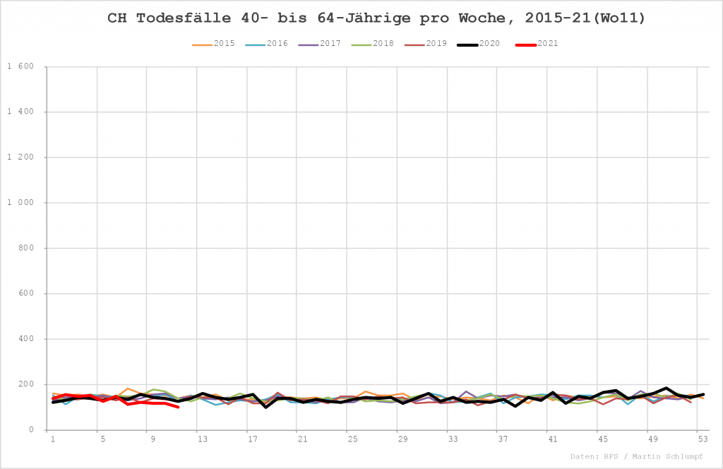 Das Bundesamt für Statistik publiziert jeden Dienstag eine neu aufdatierte Tabelle «Todesfälle nach Altersklasse, Woche und Kanton», deren Betrachtungshorizont bis ins Jahr 2015 zurückgeht. In einer ersten Spalte sind nach Wochen geordnet das Total aller Todesfälle sowie die Zahlen für die Altersklassen 0-19, 20-39, 40-64, 65-79 und über 80-Jahre aufgeführt. Danach folgt in weiteren Spalten dieselbe Auflistung für jeden einzelnen Kanton.