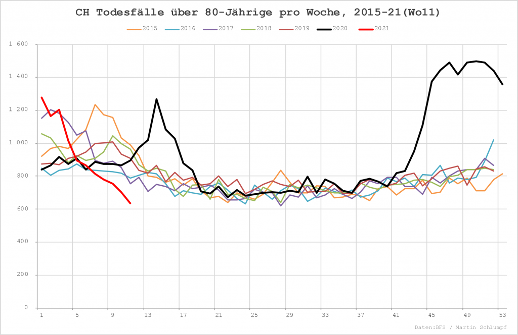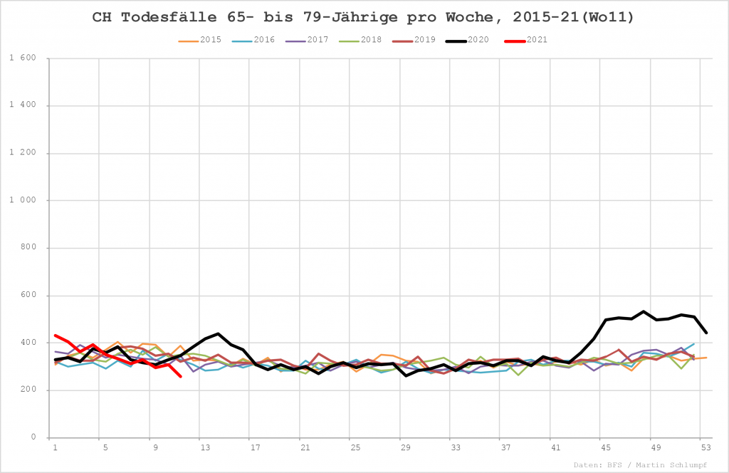 Die folgenden Grafiken visualisieren die neusten Zahlen (Bericht vom 30. März 2021), die bis Woche 11 von 2021 reichen. Die Grafiken lassen sich durch Clicken vergrössern.