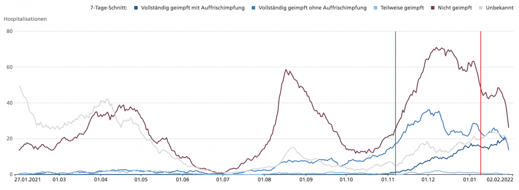 Der Befund ist eindeutig: Die Zahl der Spitaleinweisungen der Nicht-Geimpften steigt in den ersten drei Wochen von 30 auf 70 und sinkt dann auf 50, bei den Vollständig-Geimpften mit Booster beginnt sie aber fast bei Null und steigt nur auf 15 an. Die Nicht-Geimpften haben die Spitäler also drei bis sieben Mal mehr belastet, und dies, obwohl sie in der ganzen Periode nur etwa ein Drittel der Gesamtbevölkerung ausgemacht haben.