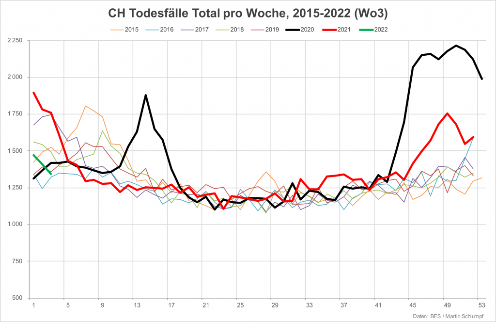 (Click auf Grafik vergrössert diese) Die Grafik zeigt die Zahl der Todesfälle pro Woche seit 2015, angeordnet in einzelnen Jahreskurven von Woche 1 bis 52/53. Zur Verdeutlichung habe ich die Corona-Jahre 2020 (schwarz), 2021 (rot) und 2022, bis Woche 3 (grün) dick herausgehoben.