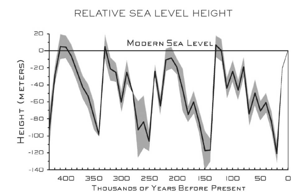 Die vertikale y-Achse zeigt die relative Höhe der Meeresoberfläche in Metern, horizontal läuft die Geschichte in Zehntausender-Jahresschritten vor heute ab. Insgesamt ist ein grobes Muster erkennbar: Einem etwa 100’000-jährigen langsamen Absinken folgt ein rasches etwa 20’000-jähriges Ansteigen. Dabei durchmisst der Meeresspiegel eine Spanne von 100 bis 120 Metern. Die markierte Nulllinie oben entspricht dem heutigen Stand.
