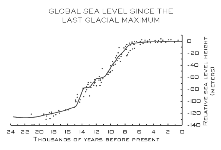 Hier sehen wir, dass der Anstieg des Meeresspiegels vor 22’000 Jahren begonnen hat. Das Tempo dieses Anstiegs hat dabei zuerst in Schüben zugenommen und ist dann aber erstaunlicherweise um 7000 Jahre vor heute beinahe zum Stillstand gekommen. Tatsächlich beträgt der Anstieg in diesen letzten 7000 Jahren nur noch 4 Meter, was einer durchschnittlichen Rate von unter 1 Millimeter pro Jahr entspricht. Auch wenn diese Kurve natürlich eine errechnete Durchschnittsentwicklung zeigt – die vielen schwarzen Punkte repräsentieren die Ergebnisse aus vielen Einzelstudien – , so lässt sie doch keinen Zweifel an der Tatsache, dass der Anstieg weitgehend zum Stillstand gekommen ist.