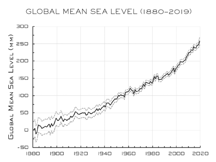 Die Messskala auf der y-Achse zeigt jetzt Veränderungen im Millimeterbereich: In den letzten 140 Jahren ist der globale Durchschnitts-Meeresspiegel in dieser Studie um 250 Millimeter gestiegen, was einer durchschnittlichen Anstiegsrate von 1.8 Millimeter pro Jahr entspricht. Dieser Wert scheint aber eher an der oberen Grenze zu sein, denn nach dem Weltklimarat-Sonderbericht über den Ozean und die Kyrosphäre von 2019 resultiert global ein Langfristtrend ab 1900 von 1,4 Millimetern pro Jahr. Bei diesem Tempo würde der Meeresspiegel also bis ins Jahr 2100 um gut 11 Centimeter steigen – Damit käme die Menschheit wohl zurecht.