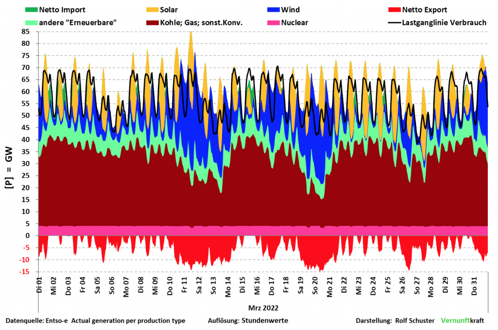 Die Grafik zeigt den Leistungsverlauf der verschiedenen Parameter über die 744 Stunden des Monats März 2022. Die Leistung wird auf der senkrechten y-Achse in Gigawatt (GW) gemessen, der Stundenablauf auf der horizontalen x-Achse mit Tagesdaten angezeigt.