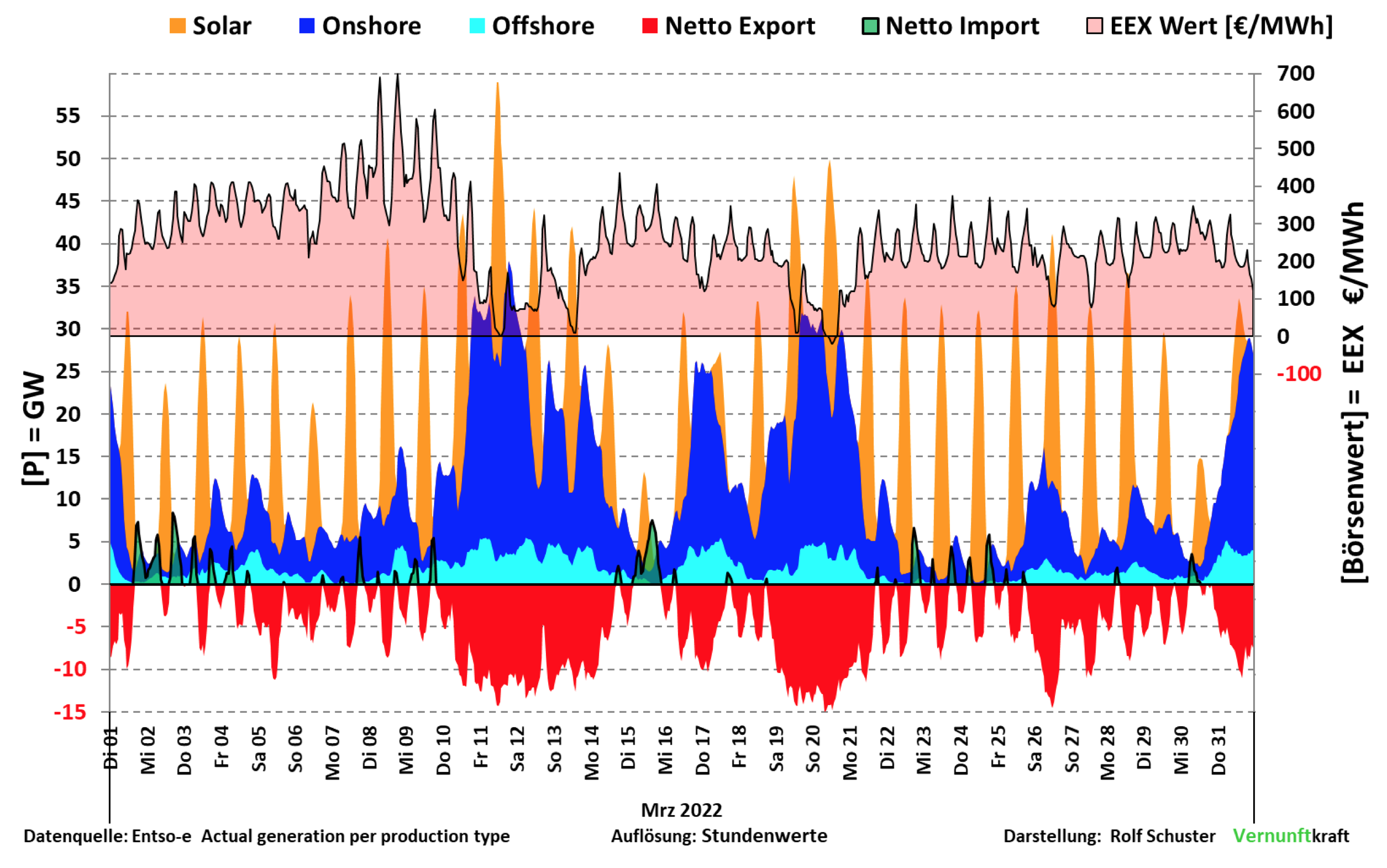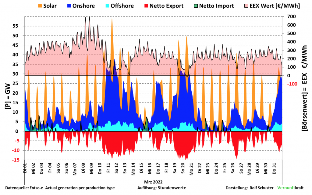 Auf der anderen Seite zeigt sich auch in diesem Monat, dass es bei starkem Wind und viel dadurch erzeugtem Überschussstrom zu grossen Nettoexporten und einem entsprechenden Preiszerfall kommt: wie am 11./12. und 20./21. März. Wenn die Energiewende also «erfolgreich» ist, macht sie die Preise kaputt und das Ausland soll den nicht gebrauchten Strom verklappen.