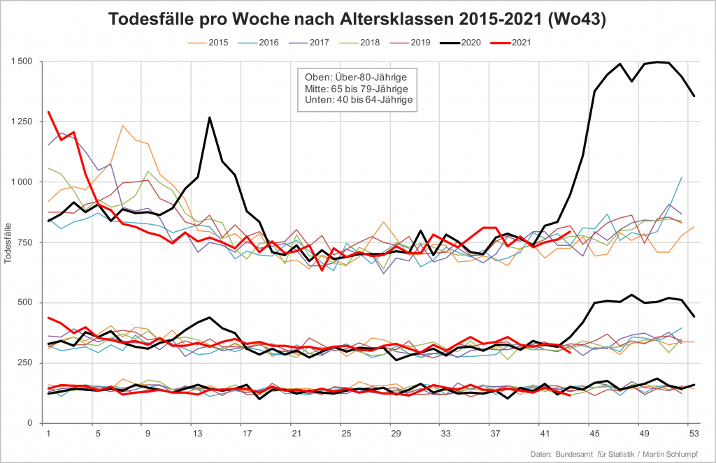 In der folgenden Grafik ist der Verlauf aller Todesfälle in der Schweiz, gruppiert nach den drei höchsten Altersklassen, im Zeitraum von 2015 bis 2021 (Woche 43) dargestellt: