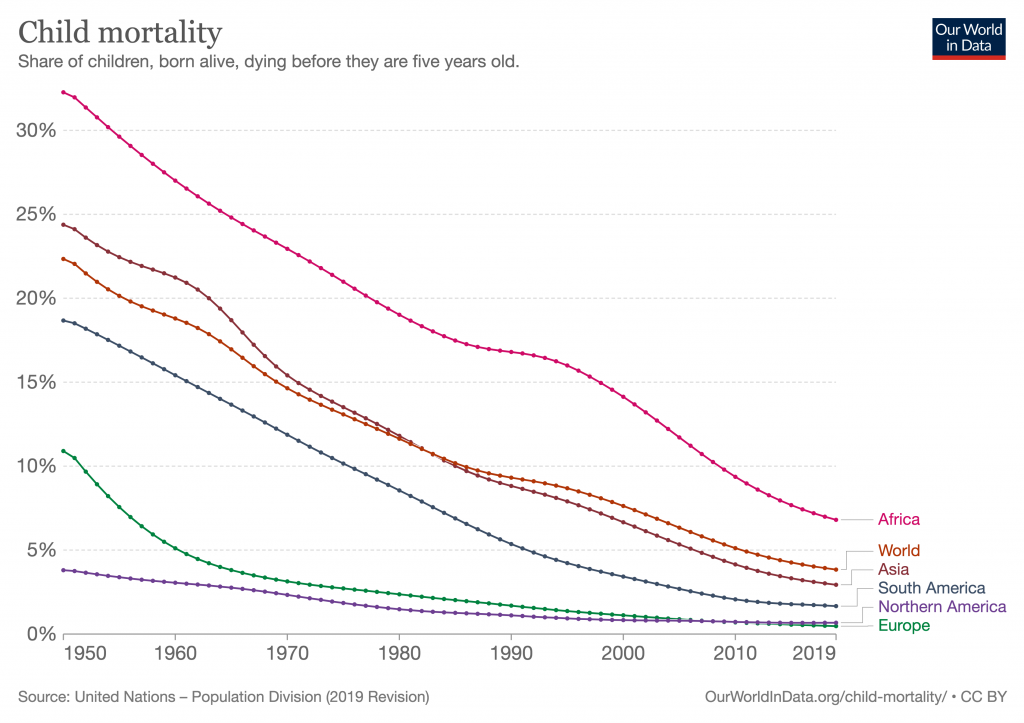 Heute sterben weltweit 83 Prozent weniger Kinder unter fünf Jahren als noch 1950. Das beweist, dass sich die Lebensqualität der Menschen enorm verbessert hat – sogar in Afrika.