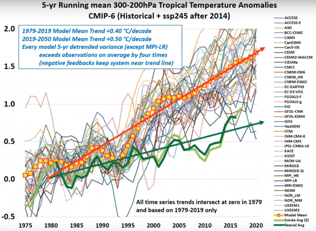 Im Unterschied zur ersten Grafik geht es hier erstens um die Temperaturabweichung in den Tropen, und zweitens sind die Resultate aus der neuesten CIMP-6-Zusammenstellung abgebildet, die für den soeben veröffentlichten sechsten Sachstandsbericht des Weltklimarates erstellt wurde. Ausserdem sind mit zwei eingezeichneten Trendlinien die Differenzen zwischen Modellierung und Realität klarer sicht- und quantifizierbar. Die grüne Trendlinie der gemessenen Daten steigt im Durchschnitt nur um 0,17 Grad Celsius pro Dekade, während der rote Modelltrend pro Jahrzehnt um 0,40 Grad Celsius zulegt: Die Modelle laufen also fast zweieinhalbmal zu «heiss».