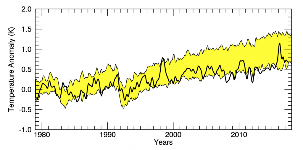 Die schwarze dicke Linie zeigt die per Satellit gemessene Entwicklung der Temperaturabweichungen in der tieferen Troposphäre von 1979 bis 2017. Das gelbe Band repräsentiert den 5 bis 95 Prozent-Wahrscheinlichkeitsbereich der Temperaturprognosen aus den Klimamodellen. Diese werden jeweils für die Sachstandsberichte des Weltklimarates in einem «Coupled Model Intercomparison Project» CMIP zusammengestellt. Hier wurden die Zahlen von CMIP-5 verwendet, die sich auf den letzten abgeschlossenen Klimabericht von 2014 beziehen. Beide Kurven sind mit ihrem Mittelwert von 1979 bis 1984 auf Null gesetzt und somit vergleichbar.