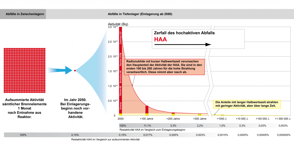 Nach ungefähr 40 Jahren ist dieser Prozess abgeschlossen. Aus den 100 Prozent Ausgangsaktivität sind dann noch 0,15 Prozent übrig (unterster Balken der Grafik), mit der die Endlagerung beginnt. Was dann in den ersten 300 Jahren in einem Tiefenlager geschieht, zeigt der mittlere Teil der Grafik. Wenn die Restaktivität bei Einlagerungsbeginn erneut als 100 Prozent gesetzt wird (zweitunterster Balken) sinkt die Strahlung gemäss den Halbwertszeiten der Radionuklide rasch ab: Schon nach 200 Jahren ist sie auf 3 Prozent abgesunken, das sind 0,005 Prozent des Anfangs. Danach bewegt sie sich kaum mehr, und trotzdem kann sie auch nie vollständig verschwinden: Nach einer Million Jahren (ganz rechts) sind immer noch 0,000005 Prozent übrig.