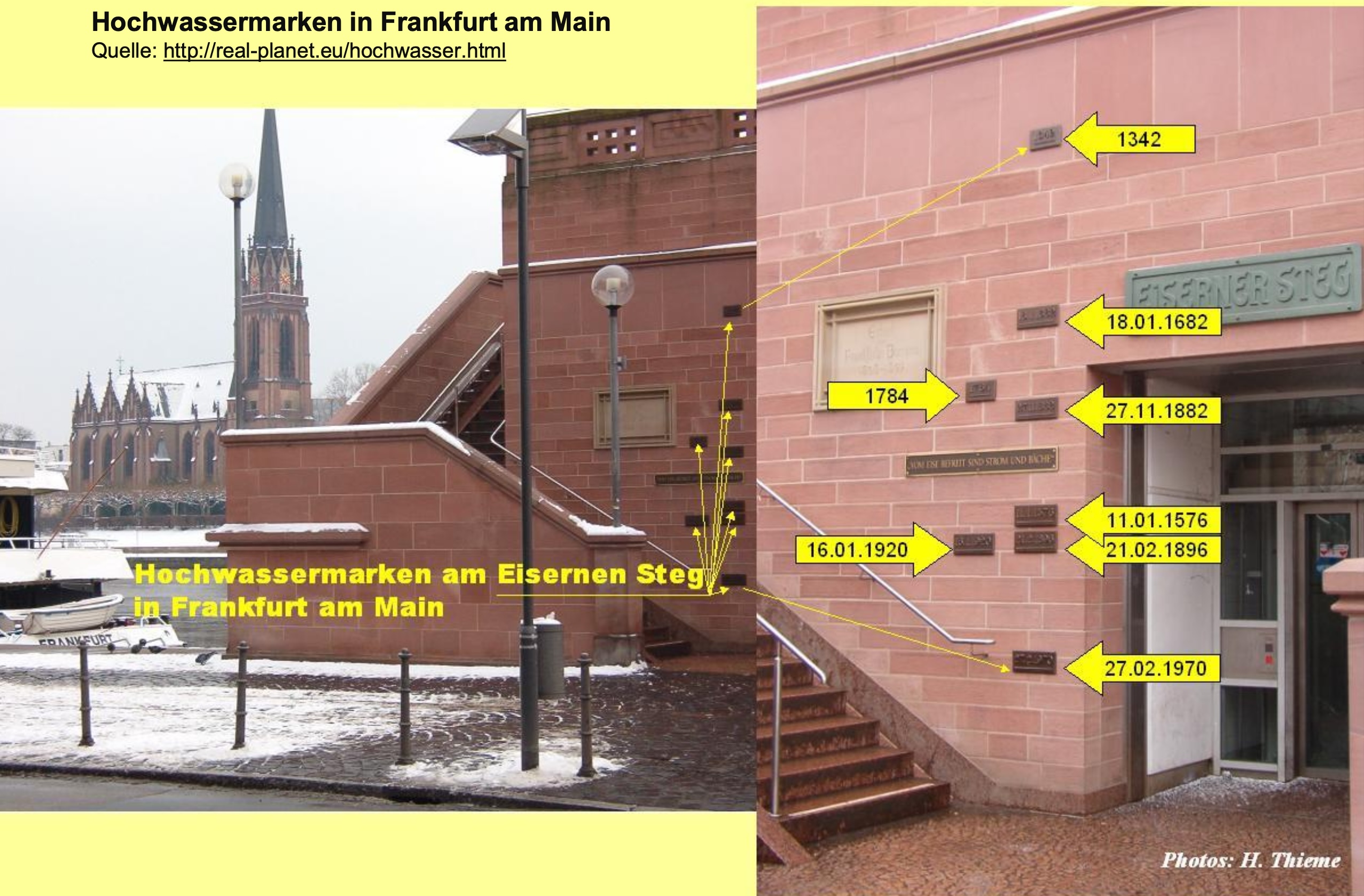 Als weitere Vergleichsquelle dienen ausserdem sogenannte Hochwassermarken, die in vielen Städten angebracht wurden. Diese zeigen die Höchststände der Wassermassen bestimmter Ereignisse mit Markierungen an wichtigen Gebäuden nahe der Flüsse. Die nächste Grafik zeigt solche Marken am Eisernen Steg in Frankfurt, einer Fussgängerbrücke über den Main: