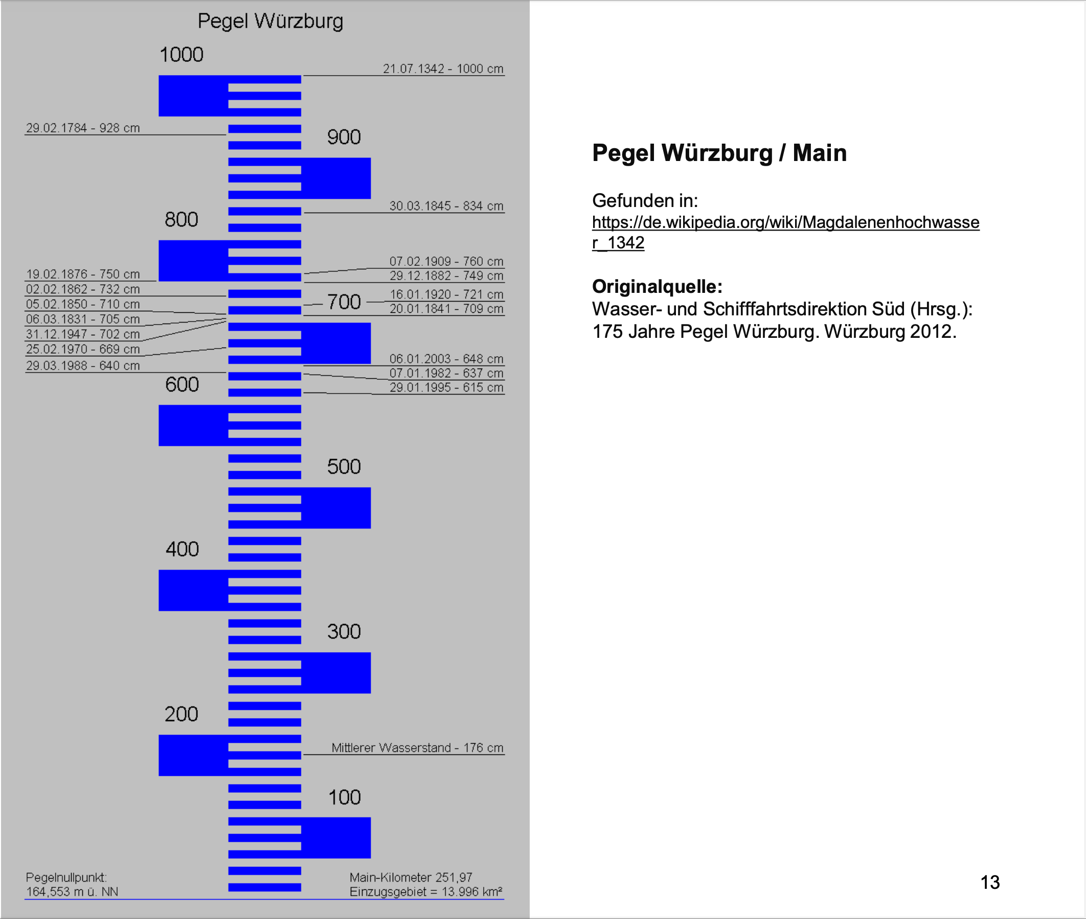 Ein solches Zeugnis ist die Darstellung verschiedener Hochwasser-Pegelstände des Main in Würzburg, die in der folgenden Grafik zu sehen sind:
