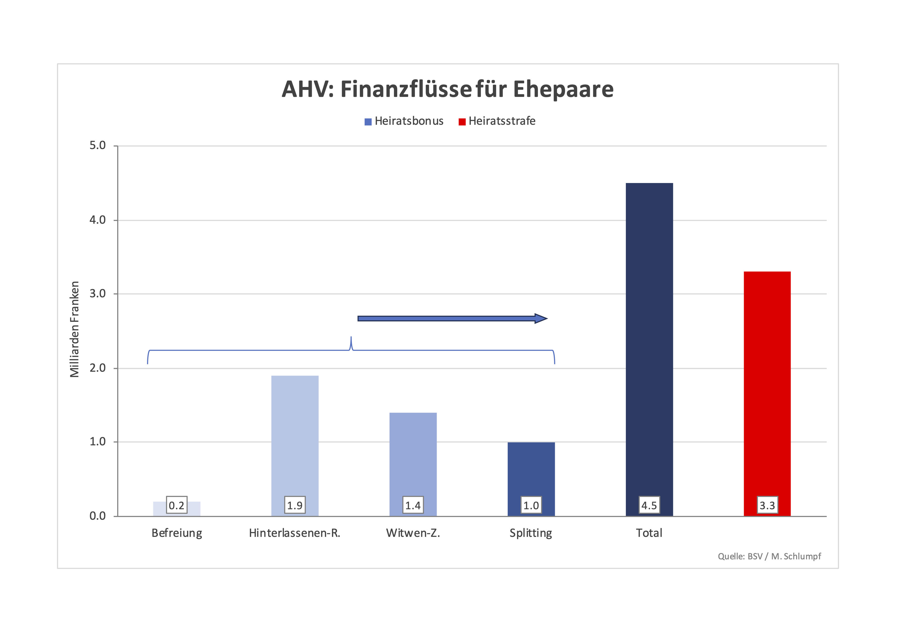 Die Grafik zeigt dunkelblau die aufsummierten Boni und rot die Verluste, die Ehepaare bei ihrer AHV-Rente gegenüber nicht verheirateten Menschen erleiden. Durch die Plafonierung der Renten auf 150 Prozent verlieren Verheiratete zwar 3,3 Milliarden Franken. Dies ist aber mit einem Bonus von 4,5 Milliarden mehr als kompensiert. Dieser Bonus setzt sich zusammen aus insgesamt 3,3 Milliarden für Renten für Witwen und Witwer, aus einer Milliarde für das Einkommens-Splitting und aus 200 Millionen für die Befreiung von der Beitragspflicht.
