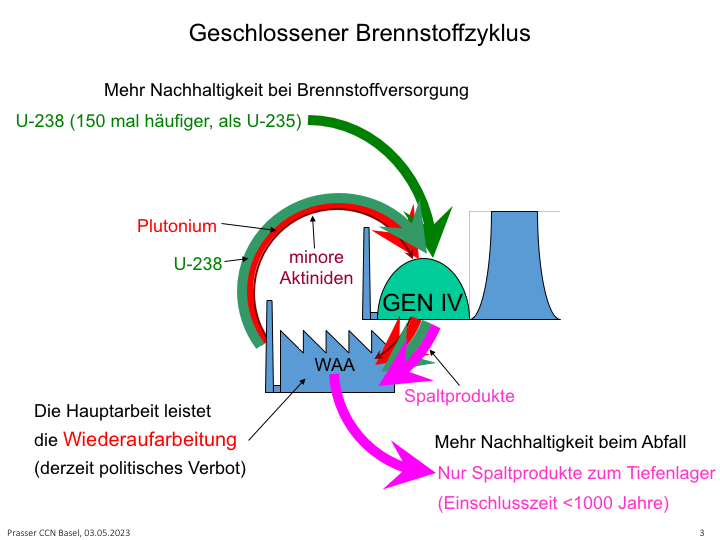Wenn wir also dereinst den Traum eines nachhaltigen nuklearen Brennstoffkreislaufs erreichen wollen, müssen wir bei uns für die Abschaffung des Verbots der nuklearen Wiederaufarbeitung kämpfen. Wenn uns dies gelingt und Reaktoren der IV. Generation erfolgreich sind, könnten wir in einer idealen nuklearen Energiewelt leben, in welcher der Brennstoff praktisch unendlich zur Verfügung steht (auch Thorium oder Uran aus dem Meerwasser könnten verwendet werden), und wo die maximale Einschlusszeit für den verbleibenden Abfall in einem Tiefenlager um Grössenordnungen kleiner wäre.