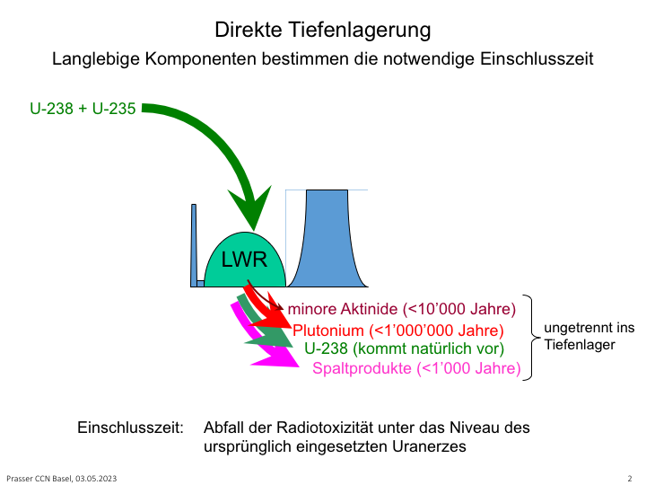 Ein Leichtwasser-Reaktor (LWR) wird mit angereichertem Uran «gefüttert» (spaltbar davon ist nur Uran-235). Dabei entstehen vier Sorten von Abfällen, die ungetrennt ins Tiefenlager gebracht werden: Zum weitaus grössten Teil ist das Uran-238, das überall in der Natur vorkommt. Die restlichen fünf Prozent bestehen aus Plutonium, den minoren Aktiniden und stabilen Spaltprodukten. Die geforderte Einschlusszeit im Tiefenlager von bis zu einer Million Jahre wird dabei vor allem vom äusserst langlebigen Plutonium bestimmt.