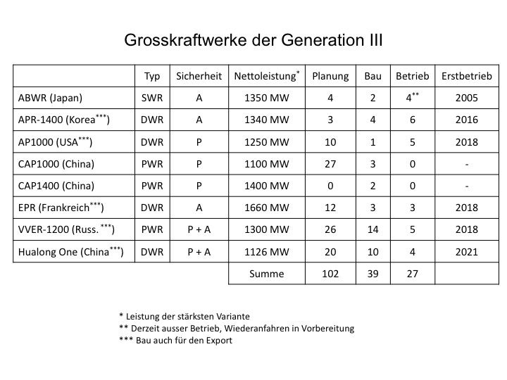 Von den acht verschiedenen Typen aus Frankreich, China, Russland, den USA, Südkorea und Japan sind bereits 27 in Betrieb. 39 weitere sind im Bau und 102 sind geplant. Dabei sind die meisten Reaktoren auch für den Export vorgesehen: Die Südkoreaner zum Beispiel planen beim APR-1400 sogar eine verbesserte europäische Version.