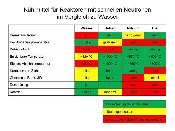 Grüne Kasten in der Tabelle bedeuten «gut und einfach in der Anwendung», rot heisst «schlecht und kompliziert in der Anwendung». Bei allen drei neuen Kühlmittel sind die Aussichten, höhere Temperaturen zu erreichen, gut. Sie besitzen zudem eine sichere Abschalttemperatur. Bei den Kriterien Korrosion und chemische Reaktivität verhalten sie sich aber unterschiedlich: Beim natriumgekühlten Reaktor ist die chemische Reaktivität schwierig zu meistern, beim bleigekühlten Reaktor ergeben sich Probleme bei der Korrosion. Der mit Helium gasgekühlte Typus schneidet zwar bei diesen Kriterien gut ab, weist jedoch den Nachteil eines hohen Betriebsdrucks auf.