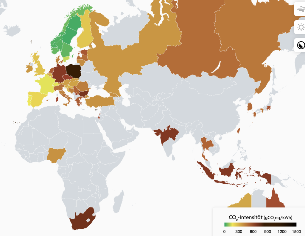 Unter den europäischen Ländern hat Deutschland mit 647 Gramm CO2-Äquivalent pro Kilowattstunde den dritthöchsten Wert (dunkelbraun). Nur Polen und Rumänien sind noch schlechter (schwarzbraun). Frankreich mit seinen Kernkraftwerken liegt mit 136 Gramm weit darunter (grüngelb). Die Schweiz gehört mit 138 Gramm ebenfalls zur Spitzengruppe bezüglich tiefer CO2-Intensität, die von Norwegen und Schweden angeführt wird (grün).