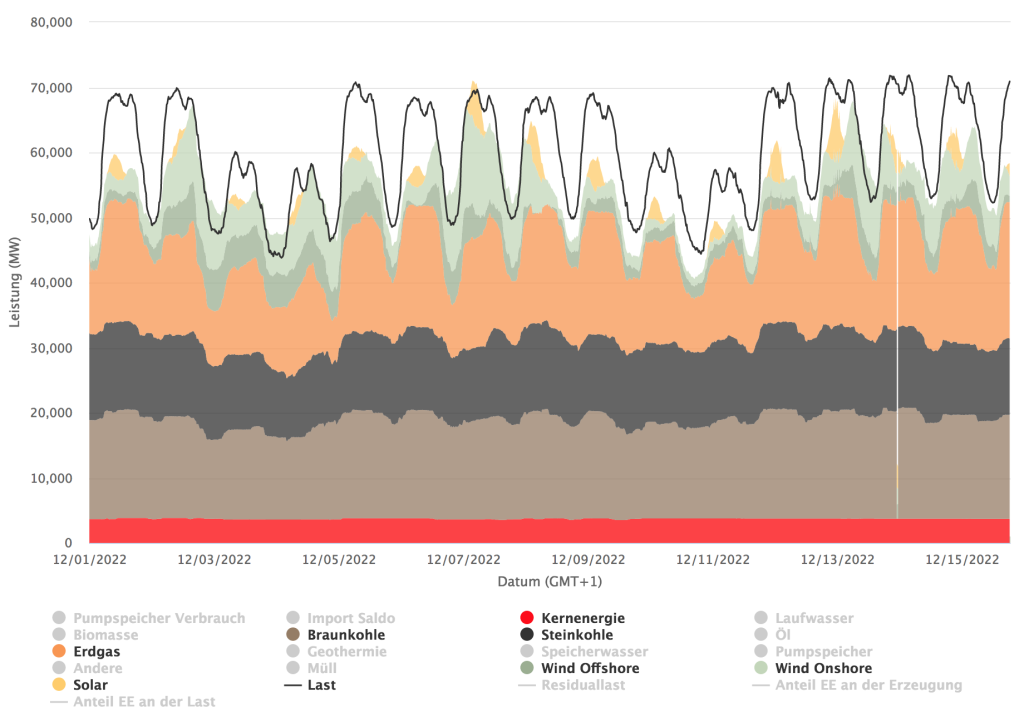 Denn wenn man den aktuellen Monat Dezember betrachtet, erzeugen die Wind- und Solaranlagen nur noch knapp 15 Prozent des Verbrauchs – also ein Viertel ihres eigentlichen Leistungspotenzials. Aber auch darauf ist nicht jederzeit Verlass, denn die Produktion schwankt von Stunde zu Stunde, diktiert von den wechselnden Wetterverhältnissen.