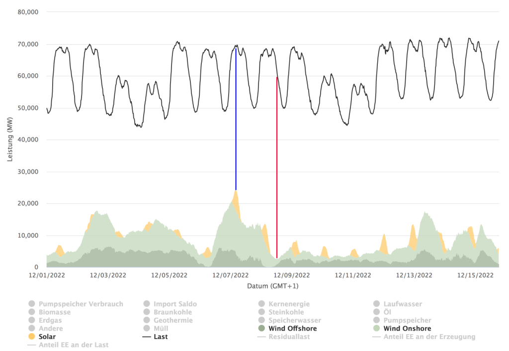Im unteren Teil der Grafik ist der Strominput aus Solar (gelb) sowie aus Offshore und Onshore Wind (dunkel- und hellgrün) eingetragen. Beim maximalen Ertrag (blauer Strich, von mir eingefügt) haben Wind und Sonne am 7. Dezember um 11.15 Uhr 35 Prozent der Last gedeckt. Minimal war die grüne Produktion am 8. Dezember um 20.15 Uhr mit 4 Prozent (roter Strich). Die dort eingetretene Windflaute dauerte fünf Tage.