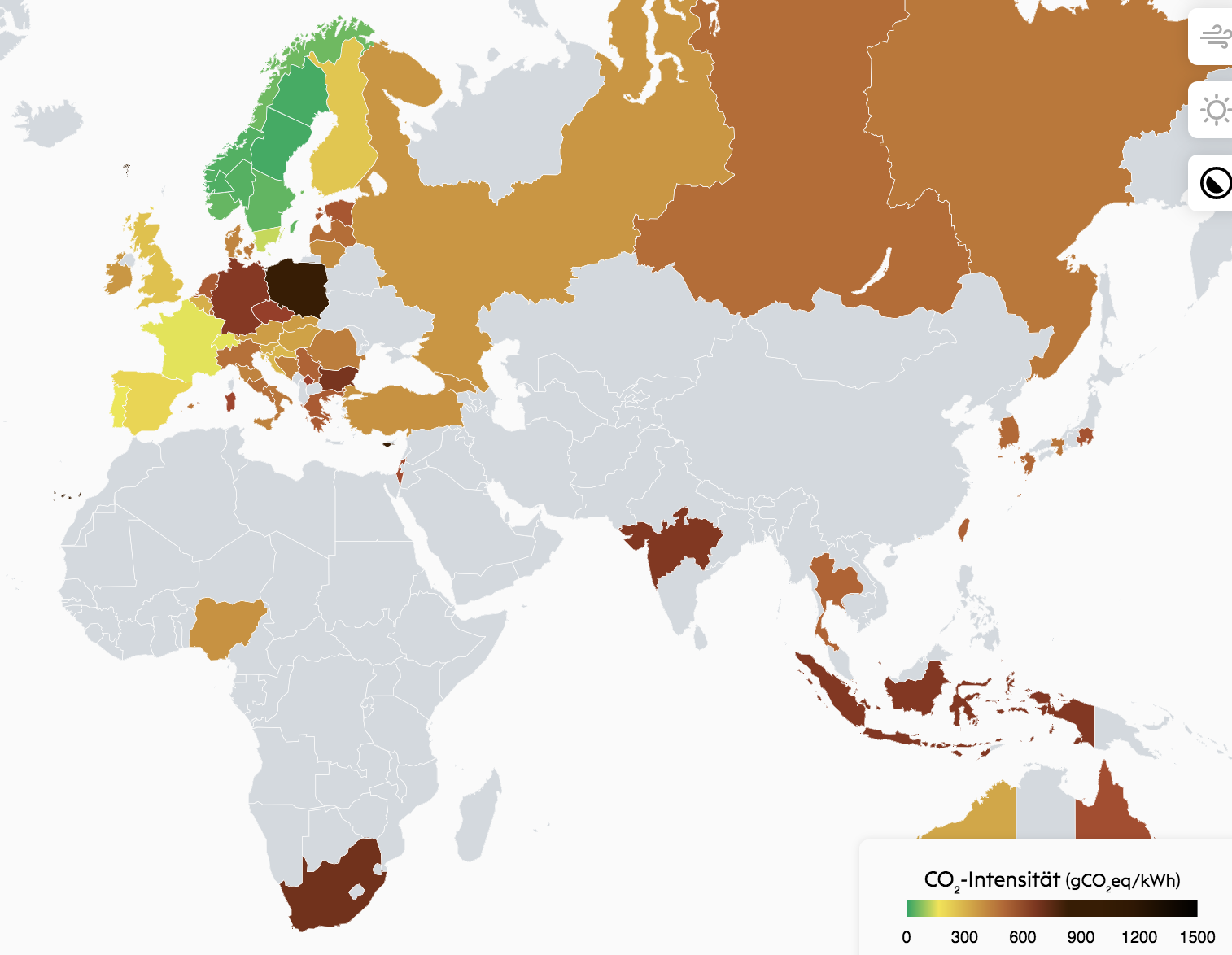 Das hat zur Folge, dass der CO2-Fussabdruck der deutschen Stromproduktion einer der schlechtesten in Europa ist. Auf der Webseite «Electricity Maps» (siehe hier) kann die Kohlenstoff-Intensität aus der Stromerzeugung weltweit verglichen werden. Die nächste Grafik zeigt einen 30-Tage-Durchschnitt bis zum 15. Dezember 2022.