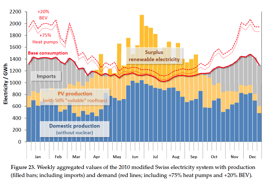 Die Empa-Studie 2019 von Martin Rüdisüli et al. modelliert ein Schweizer Stromsystem, das a) alle Kernkraftwerke (KKW) durch Photovoltaik (PV) ersetzt und b) eine 75%-Elektrifizierung des Gebäudesektors sowie eine 20%-Elektrifizierung des Verkehrs annimmt.