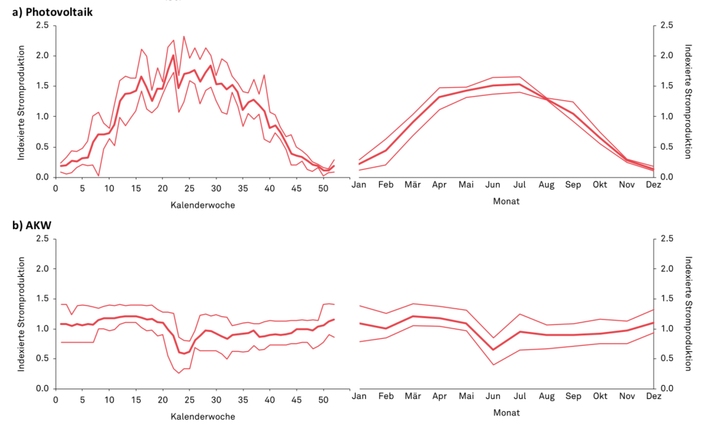 Im oberen Teil a) der Grafik sehen wir die Stromproduktion aus Fotovoltaik, im unteren Teil b) diejenige aus Kernkraftwerken. Auf der linken Seite sind die Strommengen pro Kalenderwoche über ein Jahr aufgeschlüsselt, rechts findet eine Glättung zu Monatswerten statt. Die dicke rote Linie zeigt den indexierten Durchschnittsverlauf, die feineren roten Linien markieren die jeweiligen Maxima und Minima. Die Werte sind der Datenquelle «ENTSO-E Transparency Platform» entnommen (siehe hier).