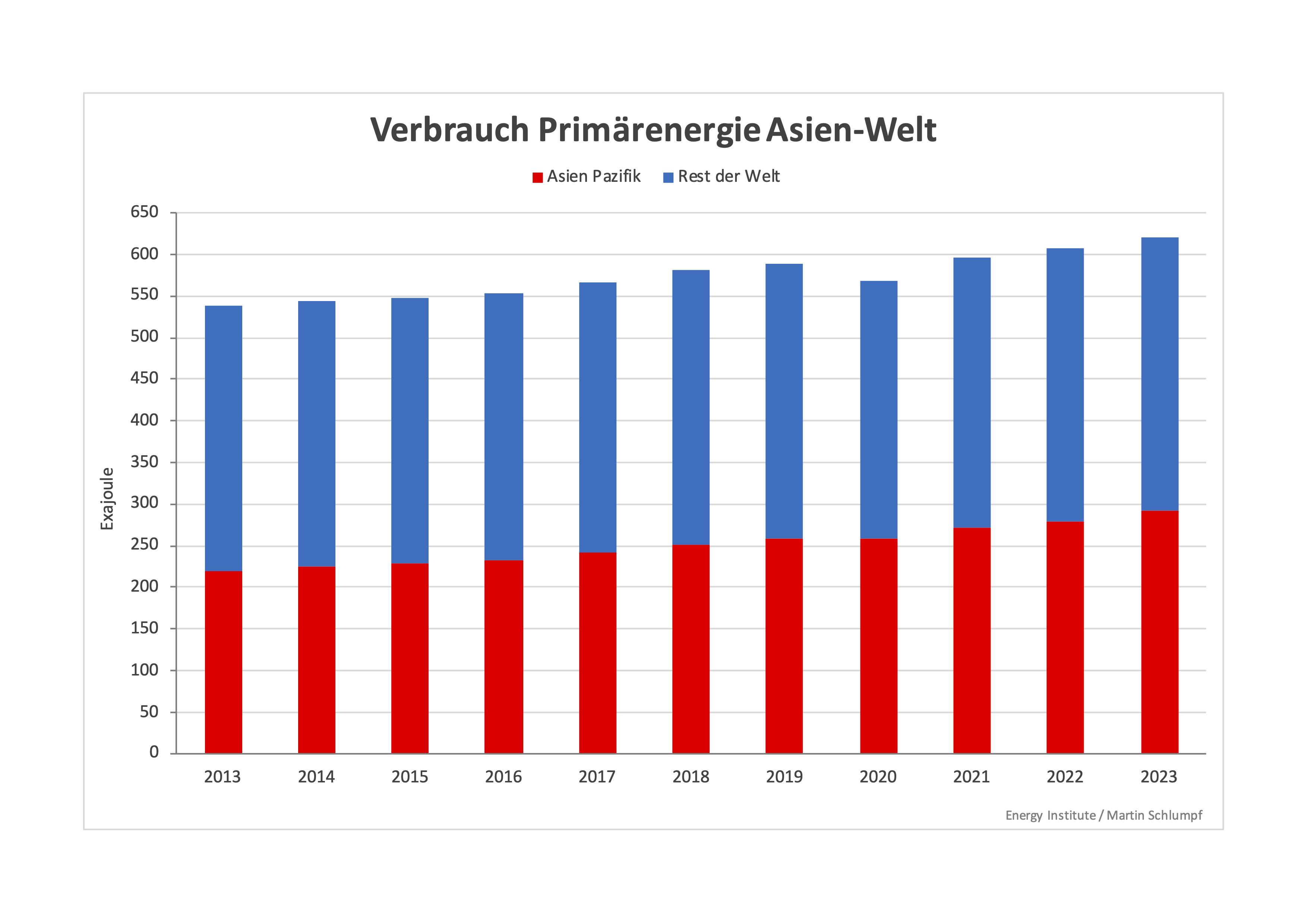 Diese «Statistical Review of World Energy 2024» beschreibt vor allem, wie sich die gesamte Energiesituation der Welt 2023 (dem Jahr mit den neuesten Daten) gegenüber dem Vorjahr verändert hat. Zudem enthält sie Entwicklungsreihen über den Zeitraum von 2013 bis 2023. Die erste Grafik zeigt für diese Zeitspanne die Entwicklung des Primärenergieverbrauchs der Welt unter spezieller Berücksichtigung des Anteils «Asien Pazifik»: