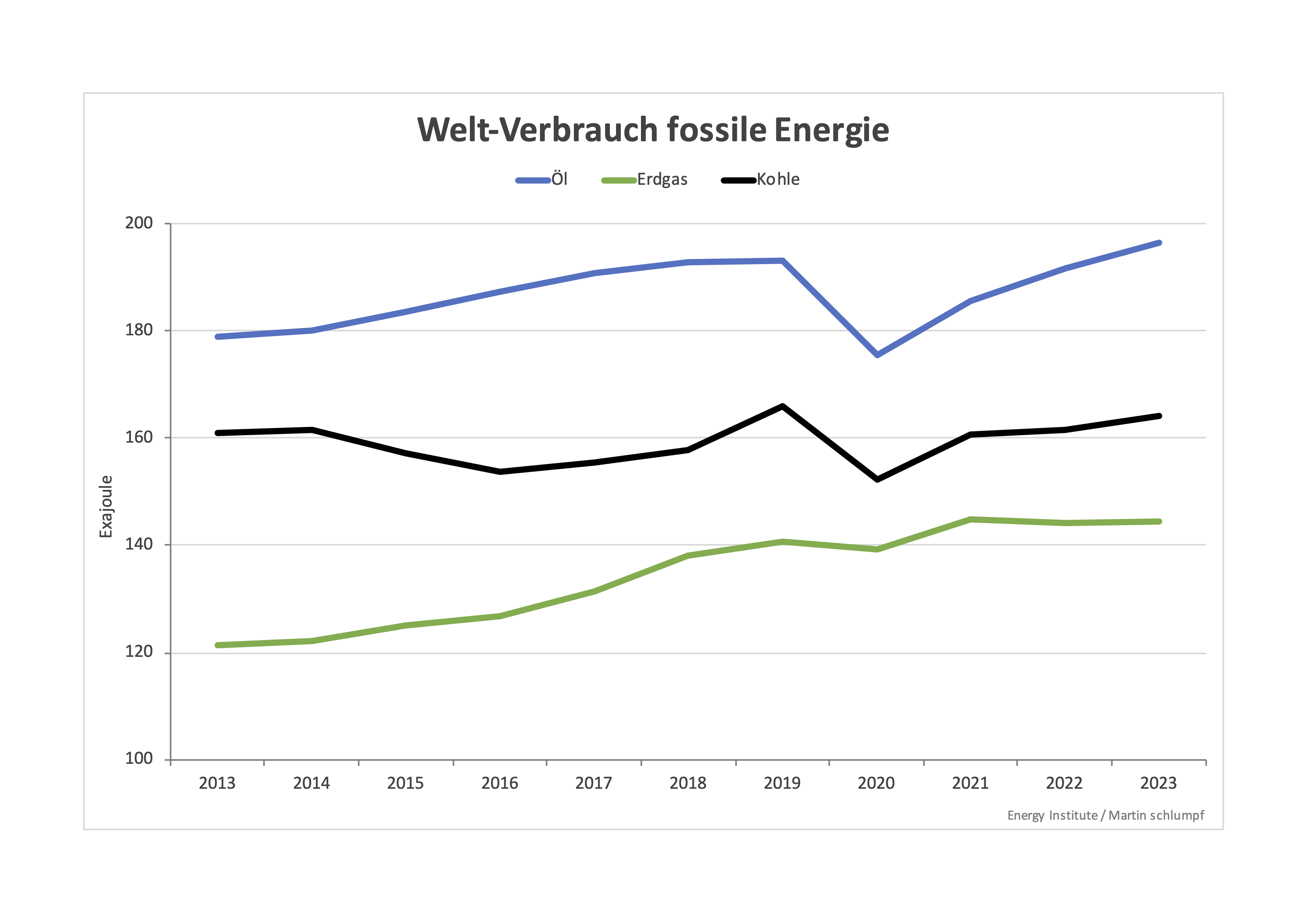 Die Grafik zeigt, dass alle drei fossilen Energieträger bis 2019 gewachsen sind. Im Folgejahr erfolgte mit Corona ein markanter Rückgang bei Öl und Kohle. Danach stiegen alle drei weiter an und führten 2023 zu einem fossilen Allzeithoch von total 505 EJ (2019 waren es 500 EJ). Die Entwicklung der drei Träger unterscheidet sich aber: Während der Verbrauch an Kohle, der umweltschädlichsten Energieform, mehr oder weniger stagniert, steigt dieser bei Öl und Erdgas weiter an.