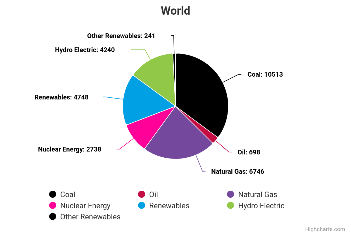 Bleibt noch der Blick auf die Elektrizitätsstatistik. Die nächste Grafik zeigt, wie viel die einzelnen Energieträger zur Stromerzeugung der Welt im Jahr 2023 beigetragen haben:
