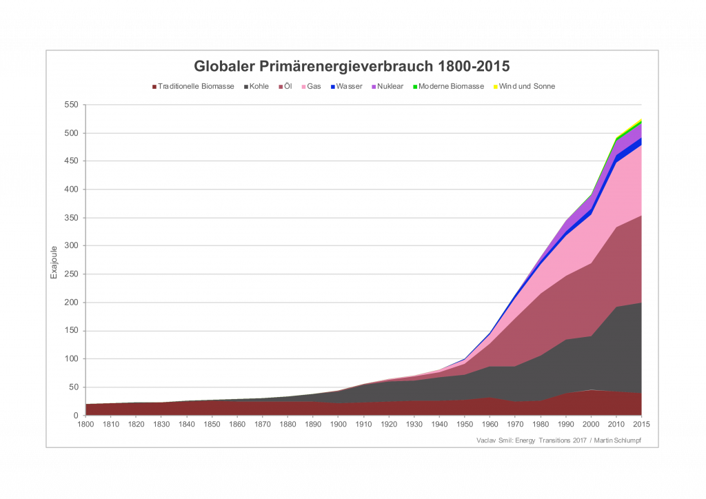 Erst vor 300 Jahren setzte eine Entwicklung ein, die die Spezies Homo sapiens in eine unseren Planeten dominierende Gattung katapultiert hat. In erster Linie ist das eine Entwicklung, die auf einer beispiellosen Ausweitung unseres Energieverbrauchs beruht. Vaclav Smil, Professor für Umweltwissenschaften an der University of Manitoba, Kanada, ein ausgewiesener Experte in Energiefragen und Verfasser zahlreicher Bücher zu diesem Thema, hat 2017 in «Energy Transitions» die bisher einzige Datengrundlage für diese Entwicklung seit dem Jahr 1800 erarbeitet. Die folgende von mir erstellte Grafik visualisiert diese Zahlen.