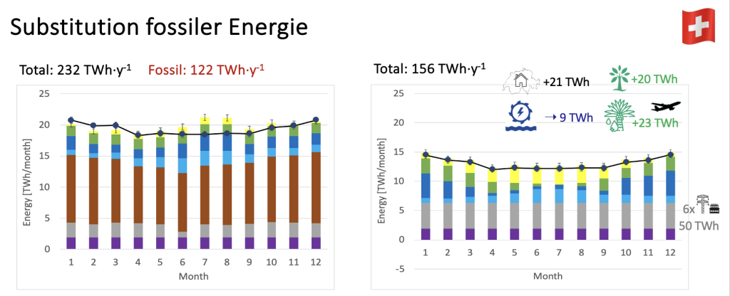 Die Studie geht davon aus, dass der gesamte Schweizer Energieverbrauch bis 2050 so weit wie möglich elektrifiziert wird. Ausser Flugkerosin werden dabei alle fossilen Brenn- und Treibstoffe (Öl, Gas) durch klimaneutrale Stromquellen ersetzt. Zusätzlich muss auch der Strom aus den heute noch laufenden Kernkraftwerken ersetzt werden. Die folgende Grafik zeigt diesen Substitutionsprozess, dargestellt in Monatswerten von Verbrauch und Produktion: