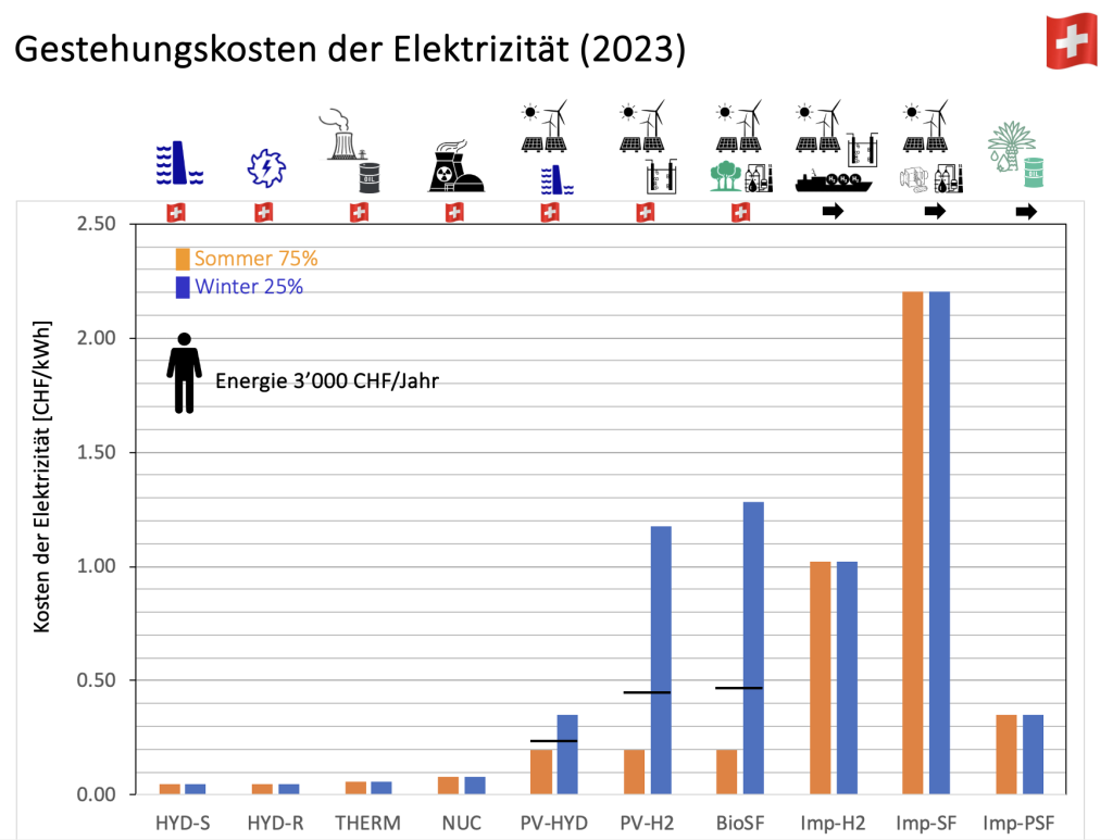 Die Kraftwerkstypen sind von links nach rechts in der Reihenfolge und mit den Symbolen angegeben, wie ich sie oben aufgeführt habe. Zu diesen sieben inländischen Typen (Symbol Schweizer Kreuz) kommen rechts davon noch drei Varianten mit Importen von Wasserstoff, Synfuel und Synfuel aus Palmöl dazu.