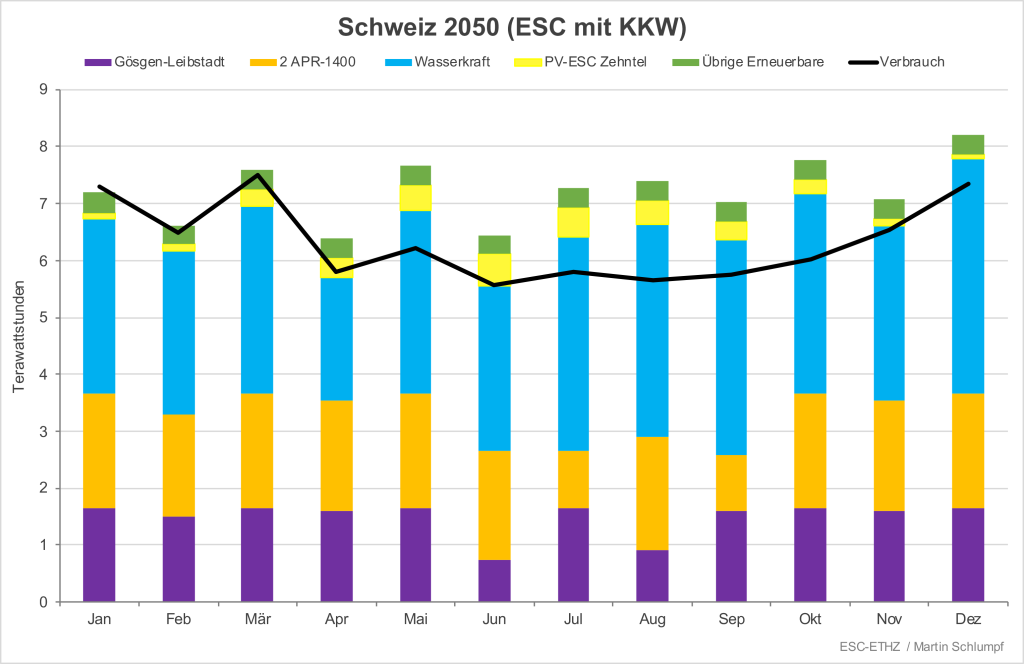 Diese Zahlen haben mir ermöglicht, ein eigenes Szenario zu rechnen, das man eigentlich von den Energieexperten der ETH erwarten müsste: Nämlich ein Netto-Null-Szenario unter Einbezug der Kernkraft. Von den ESC-Daten eines dieser Modelle habe ich dabei den Lastverlauf der Schweiz für 2050, die Wasserkrafterzeugung und die Anteile der übrigen Erneuerbaren übernommen. Dazu rechne ich mit dem Stromertrag aus den bestehenden Kernkraftwerken Gösgen und Leibstadt (mit 80-jähriger Betriebszeit) sowie zwei neugebauten Kernkraftwerken des Typus APR-1400. In Abstimmung auf diesen Kernkraft-Input habe ich die massive ESC-Solarerzeugung auf einen Zehntel reduziert.