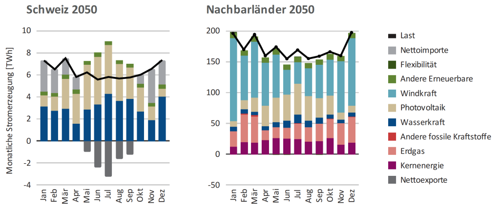 Wenn die gesamte monatliche Erzeugung kleiner ist als die Last, muss die entsprechende Lücke mit Nettostromimporten gedeckt werden (grau oben). Dies ist im gezeigten Szenario der Schweiz in allen sechs Wintermonaten und darüber hinaus sogar noch im April der Fall. Die übrigen Sommermonate zeigen teilweise grosse Überschüsse, die nur mit Stromexporten ausgeglichen werden können.