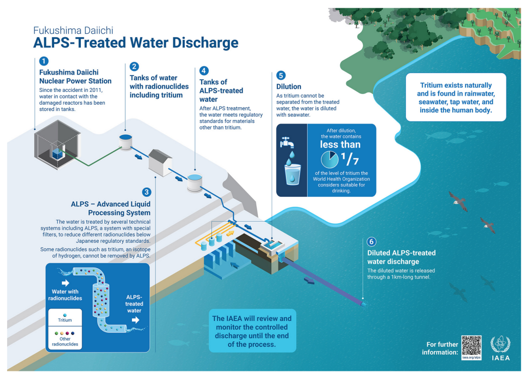 Das verdünnte Wasser wird schliesslich über einen ein Kilometer langen Tunnel ins Meer geleitet (6). Die Einleitung erfolgt in einem Gebiet, wo der Fischfang verboten ist. Wie in der Grafik vermerkt, begleitet und überwacht die IAEA den gesamten Prozess.