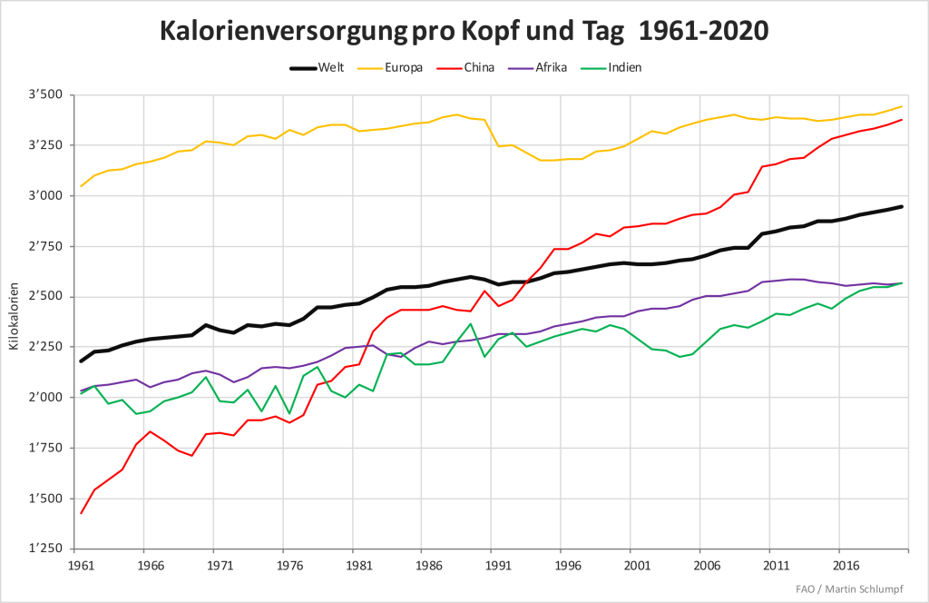 Menschen zu ernähren heisst, sie mit genügend Energie – sprich Kalorien – zu versorgen. Die folgende Grafik zeigt die Entwicklung der Pro-Kopf-Versorgung mit Kalorien anhand von Zahlen der Ernährungs- und Landwirtschaftsorganisation der Uno (FAO, siehe hier). Der betrachtete Zeitraum ist 1961 bis 2020.