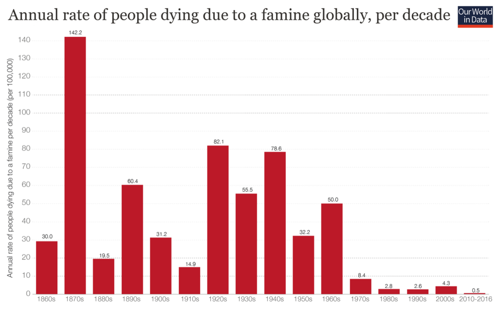 Die hier ausgewiesenen Opferzahlen beziehen sich immer auf den Durchschnitt eines ganzen Jahrzehnts, und sie geben die Anzahl der Todesfälle pro 100’000 Menschen wieder, das heisst, das Bevölkerungswachstum ist eingerechnet. Das Resultat ist kaum fassbar: Ab Mitte des 20. Jahrhunderts sinkt die Gefahr, an einer Hungersnot zu sterben, signifikant, und sie verschwindet im 21. Jahrhundert fast vollständig.
