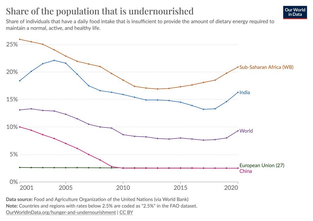 Diese kurze Unterbrechung des allgemeinen Fortschrittstrends betrifft vor allem Schwellen- und Entwicklungsländer: In Indien, dem Bevölkerungsgiganten noch vor China, ist die Quote der Unterernährten von 14 auf 16 Prozent gestiegen. Weltweit am schlimmsten aber ist die Situation in Sub-Sahara-Afrika, wo der Anteil zwischen 2013 und 2020 von 16 auf 21 Prozent gewachsen ist, möglicherweise wegen verteuerten Lebensmitteln.