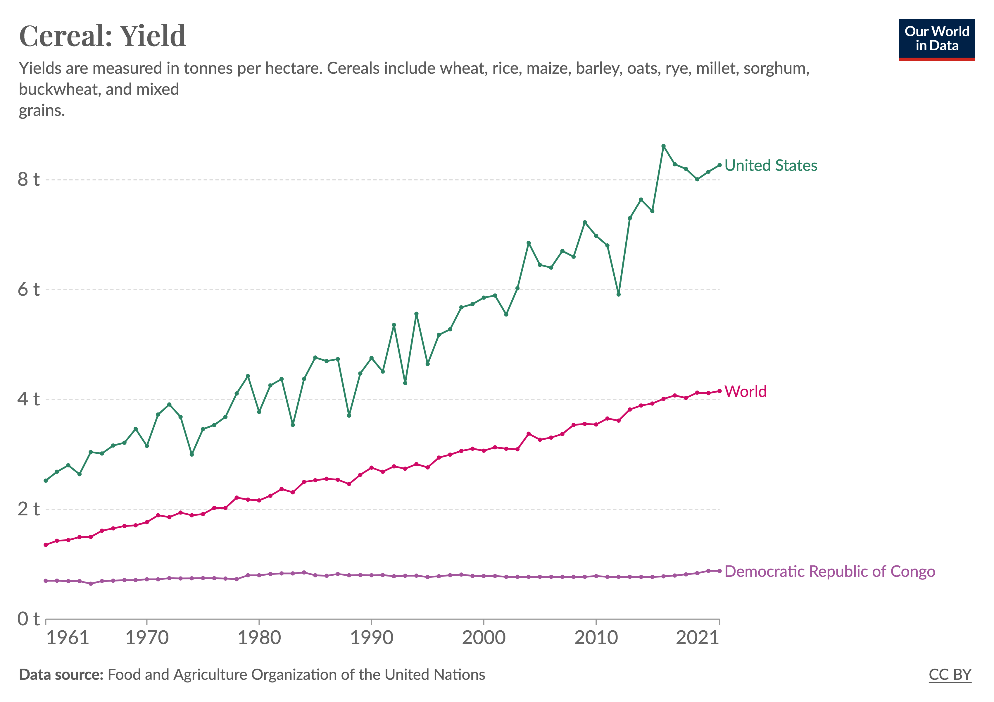 (Click auf Grafik vergrössert diese) Unter Getreide sind hier alle wichtigen Sorten zusammengefasst: Weizen, Reis, Mais, Gerste, Hafer, Roggen, Hirse, Sorghum und Buchweizen. Der gesamte Weltertrag (mittlere Kurve) lag 1961 durchschnittlich bei 1,35 Tonnen pro Hektare, und konnte bis 2018 auf 4,07 Tonnen gesteigert werden – ein Plus um den Faktor 3. Aufschlussreich ist der Vergleich mit den kontinentalen Extremen (ich musste die ursprüngliche Grafik ersetzen: Statt Nordamerika ist jetzt die US, und statt Afrika ist jetzt die Demokratische Republik Kongo zu sehen): Während Nordamerika (obere Kurve) mit modernster Technik 2018 7,64 Tonnen pro Hektare ernten konnte, waren es in Afrika (untere Kurve) weitgehend ohne diese Technik lediglich 1,62 Tonnen. Und auch der Steigerungsfaktor seit 1961 liegt in Nordamerika bei 3,5, in Afrika aber nur bei 2.