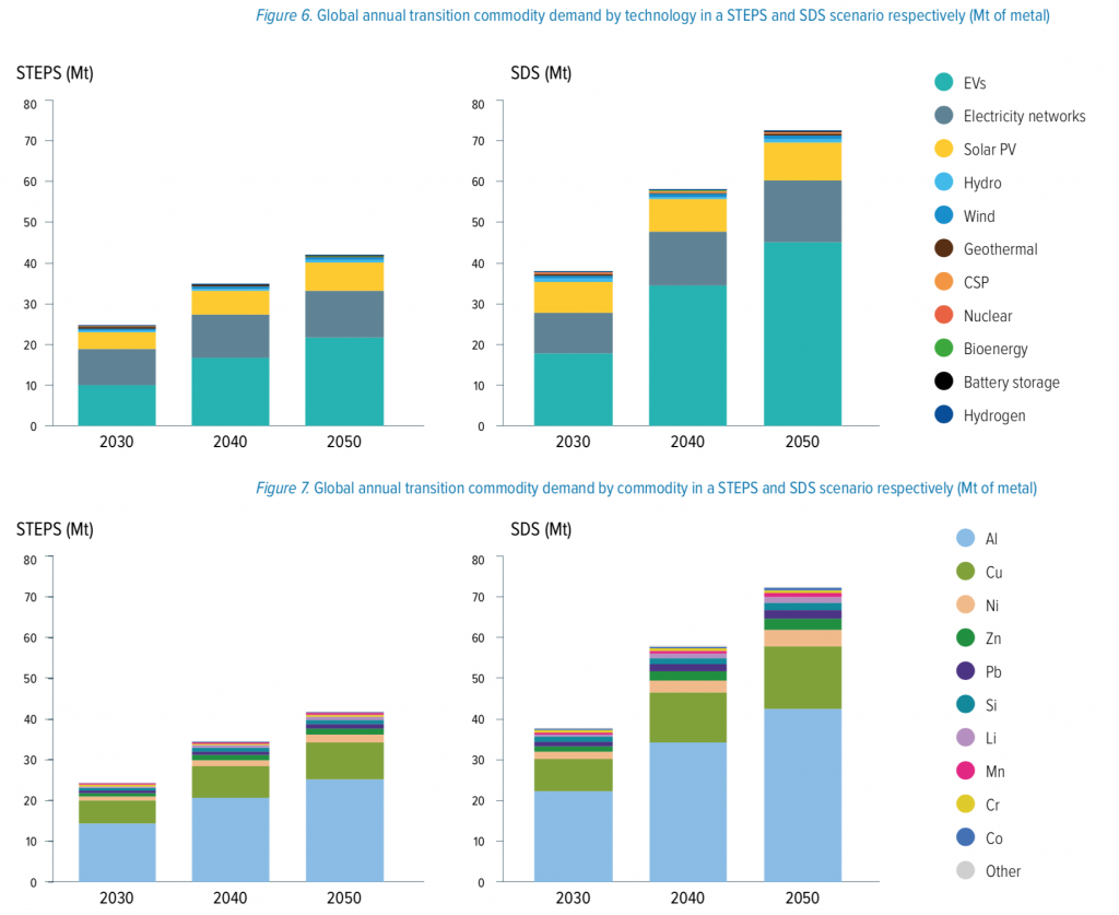 Im unteren Teil der Grafik sind dieselben Mengenangaben angeführt, aufgeschlüsselt nach den benötigten einzelnen Metallarten. Hier sehen wir, dass die grösste Nachfragesteigerung beim Aluminium eintreten wird. Wesentlich weniger hoch wird der Mehrverbrauch beim Kupfer geschätzt. Dahinter kommen Nickel, Zink, Blei, Silizium und Lithium.
