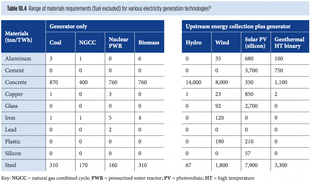 Man darf aber diese Zahlen sicherlich nur als grobe Grössenordnungen verstehen, denn Aussagen über den Ressourcenverbrauch sind komplex, oft unvollständig und auch widersprüchlich. Immerhin scheint die grobe Materialzusammensetzung einzelner Stromerzeuger ablesbar zu sein. Ein Kernkraftwerk benötigt dabei vor allem Beton, etwa fünfmal weniger Stahl und nochmals viel weniger Eisen, Kupfer und Blei. Bei Fotovoltaik-Anlagen ist dagegen der Stahlverbrauch im Vordergrund (in diesem Ausmass aber wohl, weil die USA als Referenz gilt), dann folgen Zement und Glas, dann Kupfer und Aluminium, dann Beton und Plastik und zuletzt Silizium.