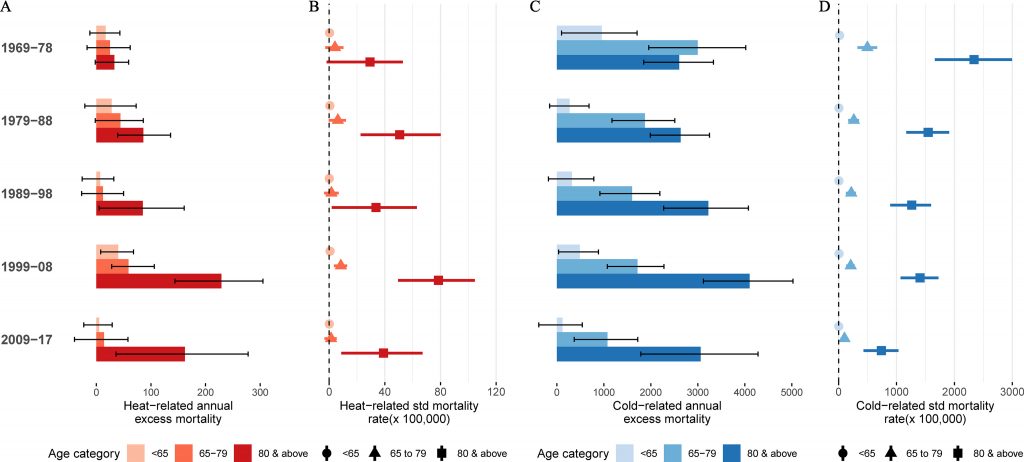 Und wie sieht es bei den Auswirkungen kalter Temperaturen aus? Die Resultate finden sich in Kolonne D, wobei zu beachten ist, dass hier mit einer Skalierung auf der x-Achse bis 3000 gegenüber der Hitze-Kolonne B, die nur bis 120 geht, viel grössere Zahlen gezeigt werden. In allen Altersklassen sehen wir hier einen Rückgang der Sterblichkeitsquoten über die ganze Periode: Bei den Unter-65-Jährigen von 17 auf 2, bei den 65-79-Jährigen von 497 auf 101 und bei den Über-80-Jährigen von 2339 auf 738. Die Gefahr an Kälte zu sterben ist also in allen Altersklassen um 68 bis 88 Prozent gesunken. Umgerechnet auf die gesamte Bevölkerung ist die Quote von 104 auf 49 zurückgegangen.