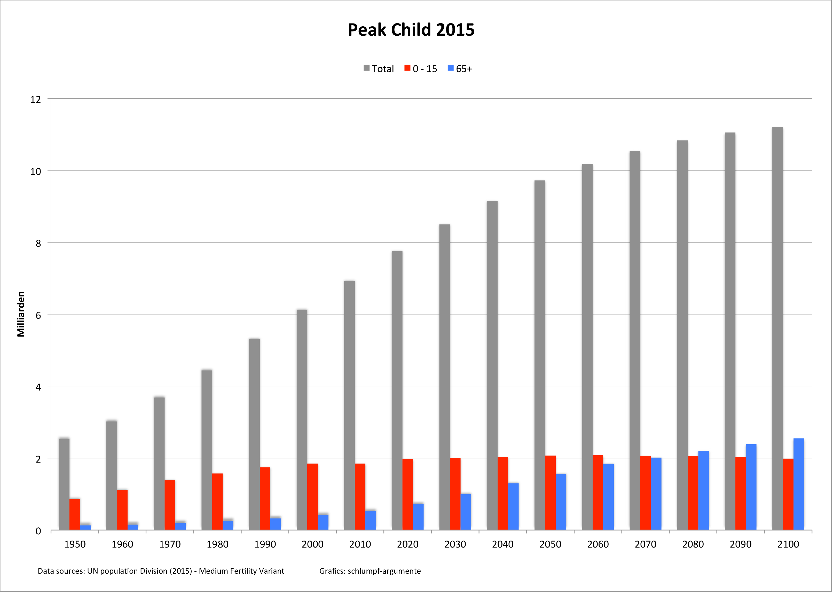 Deutlich zu erkennen ist das kontinuierliche Anwachsen der Zahl der Kinder unter 15 Jahren bis etwa 2015 – danach bleibt sie konstant. Da gleichzeitig die Gesamtzahl der Menschen aber weiter wächst, sinkt ihr prozentualer Anteil kontinuierlich von 1950 bis 2100 von 34% auf 18%, was entscheidend zur Beruhigung des Wachstums beiträgt.