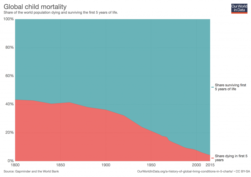 Diese Entwicklung ist in der folgenden Grafik visualisiert: Die rote Fläche im untern Teil zeigt über die letzten 215 Jahre den Anteil von Kindern, die unter 5 Jahren gestorben sind, verglichen mit allen andern, die die ersten 5 Jahre überlebt haben (blau).